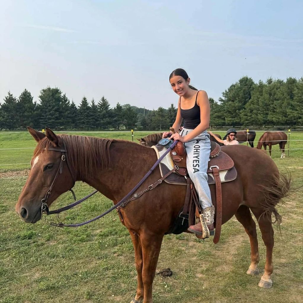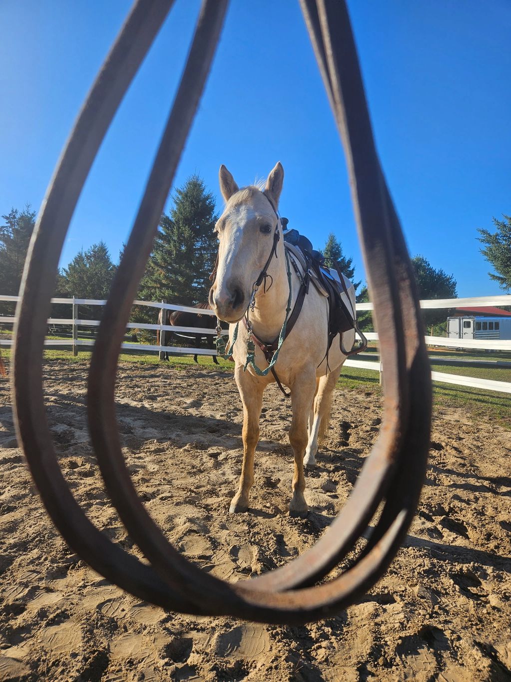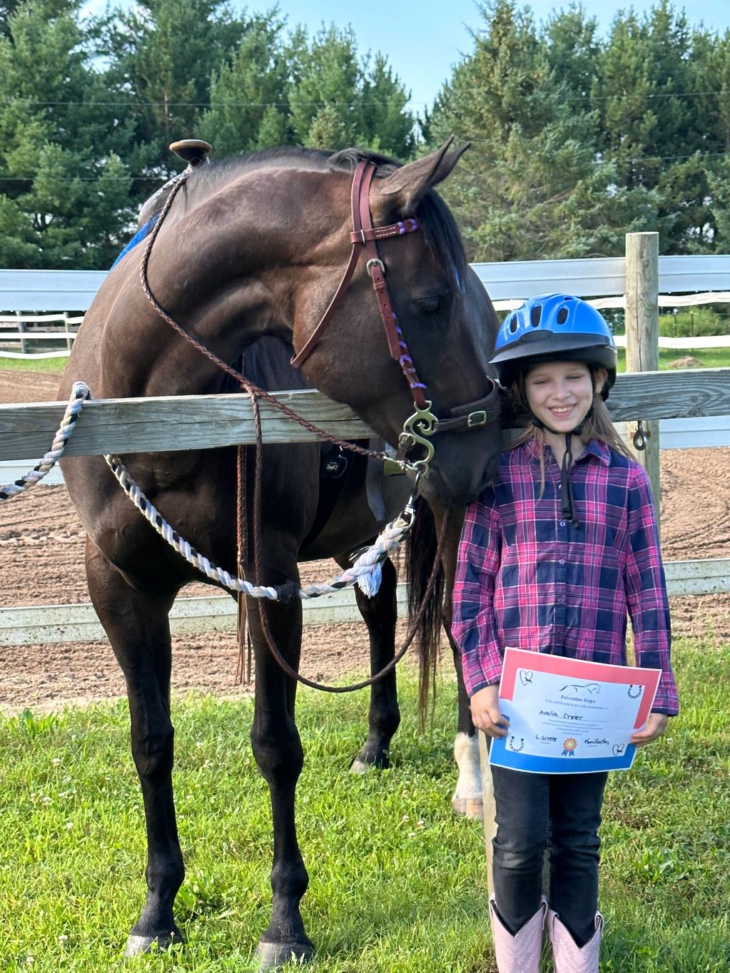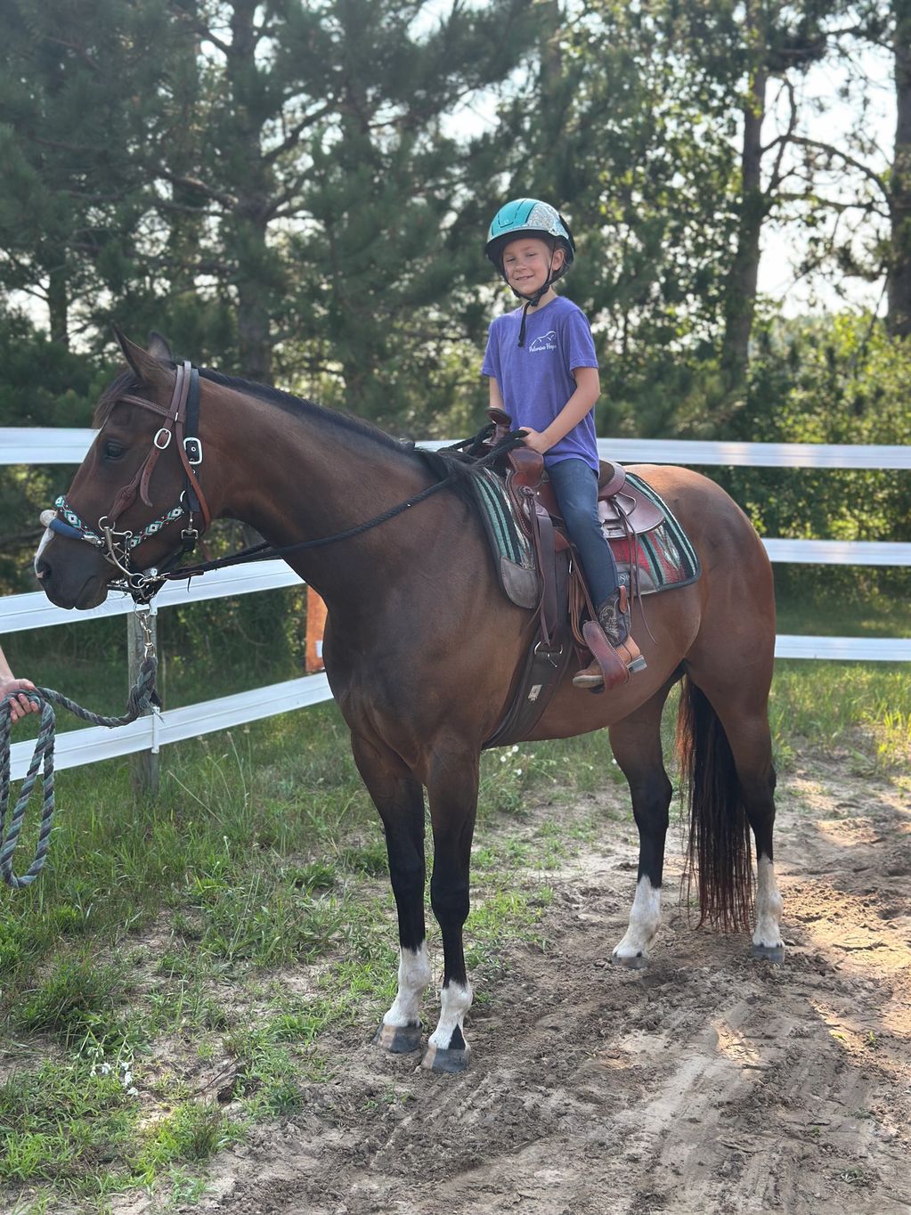 "Dreamer", owned by Kim Reiter, is a rescue Arabian. We all agreed that we have never seen a horse love to be around children as much as Dreamer. Dreamer needs special care, as he has a bad eye. Kim takes very good care of him. After the 2025 season, Dreamer moved to North Dakota with Kim to live out his spoiled years. :)