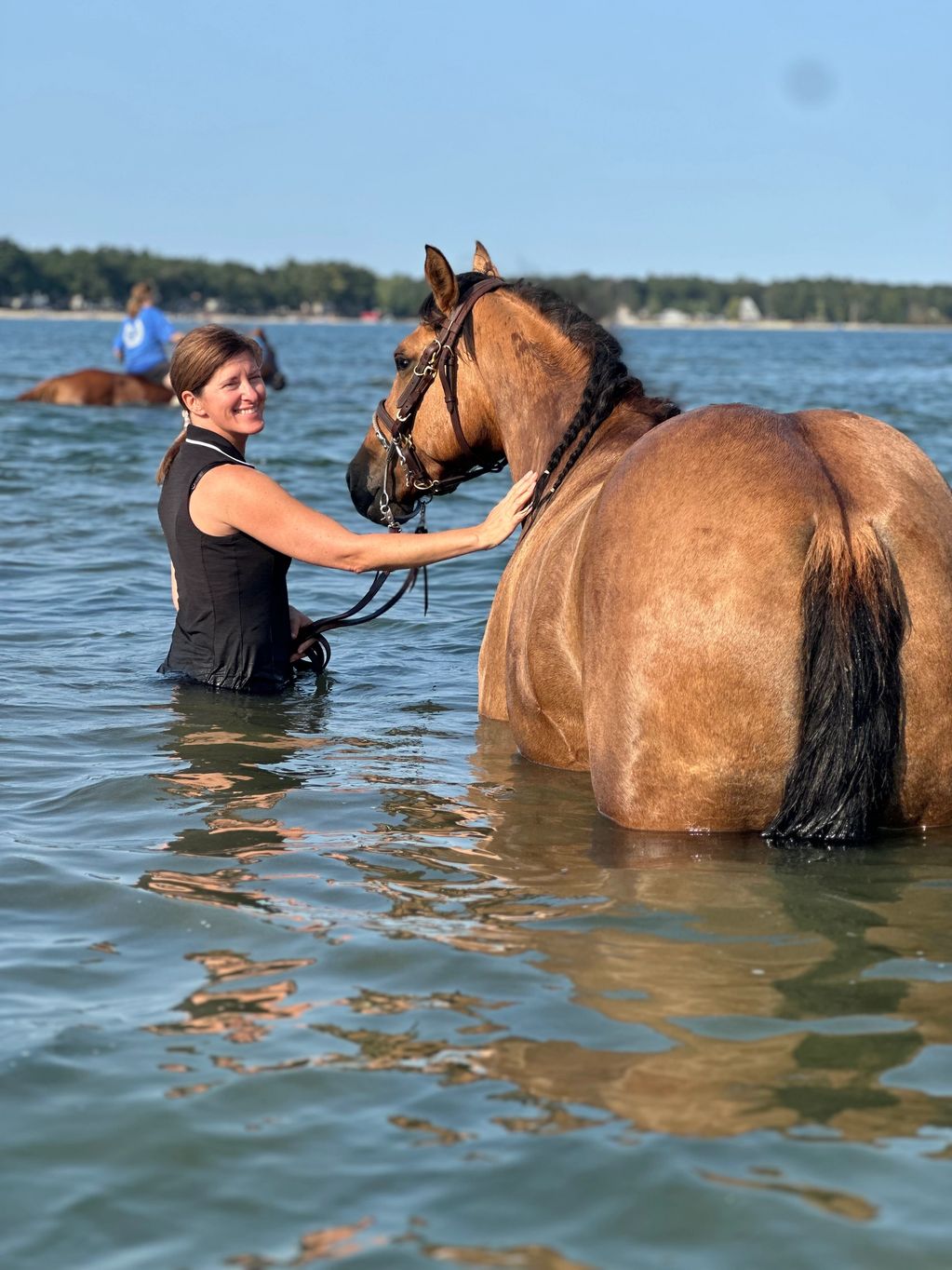 "Austin", the old man of the herd, is owned by The Tobias Family of Lansing. Austin is a retired jumper who absolutely LOVES the water.