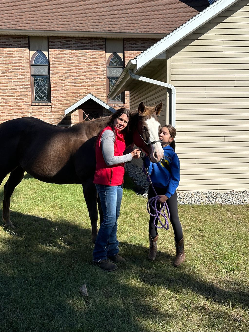 "Honey", a 13 year old paint that has been on the property since she was 3, is the cutest mare. Honey is owned by Laurel, but leased by the Buchanan family for their daughter, Laken. In the picture: Honey, Laurel, and Laken at the 20254 Blessing of the Animals at a local church. :)